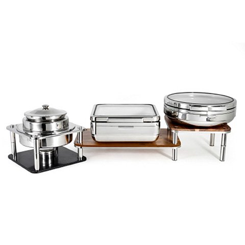 Keep food piping hot for your guests with the Tiger Hotel Domino Hot Station. This complete hot food setup includes a Domino soup station dispenser crafted with a sleek stainless steel housing and acacia wood base. It's joined by two induction chafing dishes that keep contents gently heated at the perfect temperature. Together, the station allow you to serve a variety of hot soups, dips, entrees, and more.