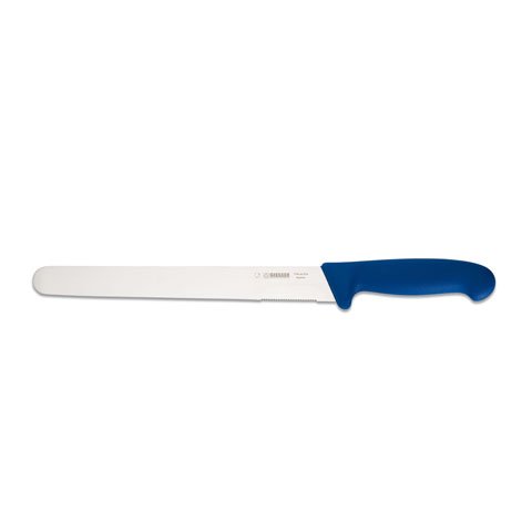 The Giesser Slicer With Partly Serrated Edge And TPE Handle boasts a blade crafted from high-grade chrome molybdenum steel, which is hardened in vacuum process to 56 - 57 Rockwell hardness grade. The cutting edge is matt-polished to offer optimum rust resistance. With 1mm tooth pitch, its partly serrated edge enables fast and easy cutting of artificial and natural intestine casings. Its blade tip is rounded for added safety at the workplace. Its handle is suitable for contact with food, and is made of a standard plastic that is especially non-slip and pleasantly easy-to-grip material (TPE). The well shaped protective guard provides a secure hold and reduces the risk of the hand slipping when holding the knife. While the knife is dishwasher-safe, manual cleaning is recommended to protect the cutting edge.